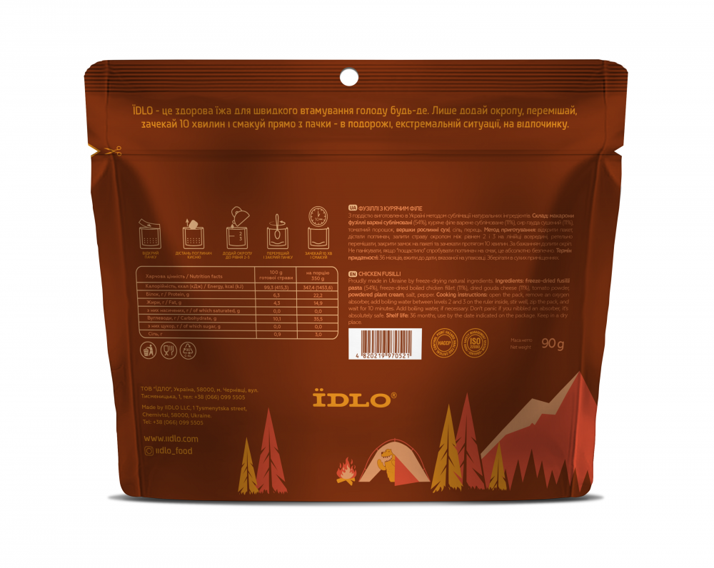 Склад: макарони фузіллі варені сублімовані (54%), куряче філе варене сублімоване (11%), сир гауда сушений (11%), томатний порошок, вершки рослинні сухі, сіль, перець.