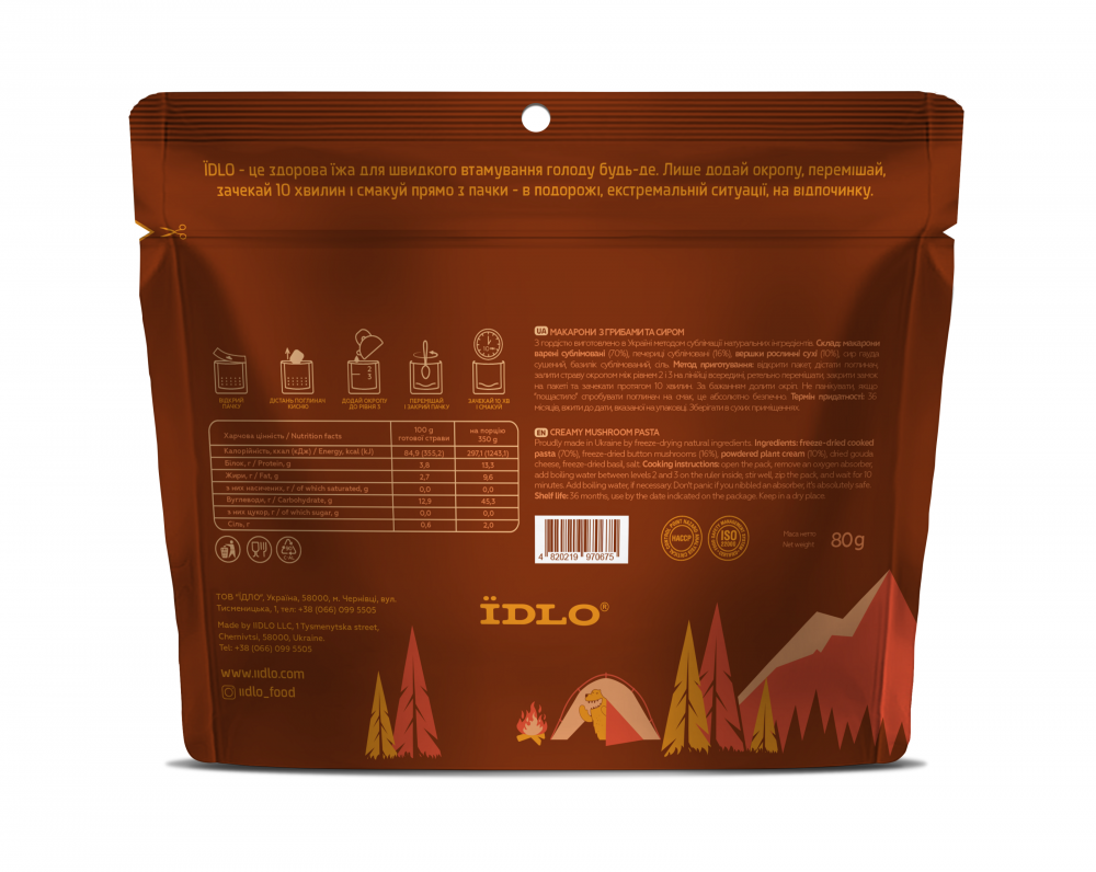 Це стане вашим секретом польової кухні. Наші сублімовані макарони з грибами і вершками, сиром гауда та базиліком дозволяють швидко приготувати ресторанну страву у власному домі. Завдяки сублімації, вона зберігає бездоганний смак, дозволяючи вам створювати кулінарні шедеври буквально за лічені хвилини. Макарони Ез грибами і сиром від ЇDLO це ідеальний вибір для тих, хто любить класичний насичений смак. Ви можете готувати цю страву будь-де, вам знадобиться лише окріп і трішки терпіння!