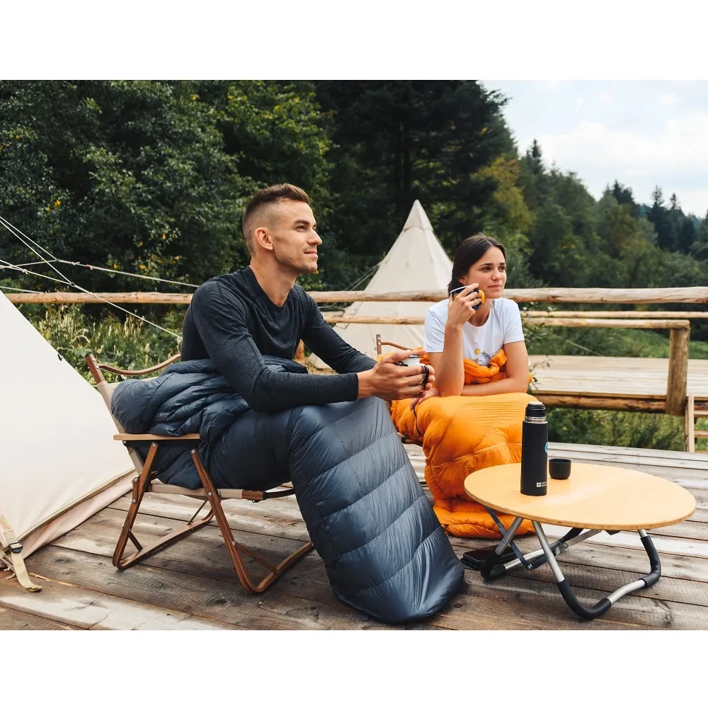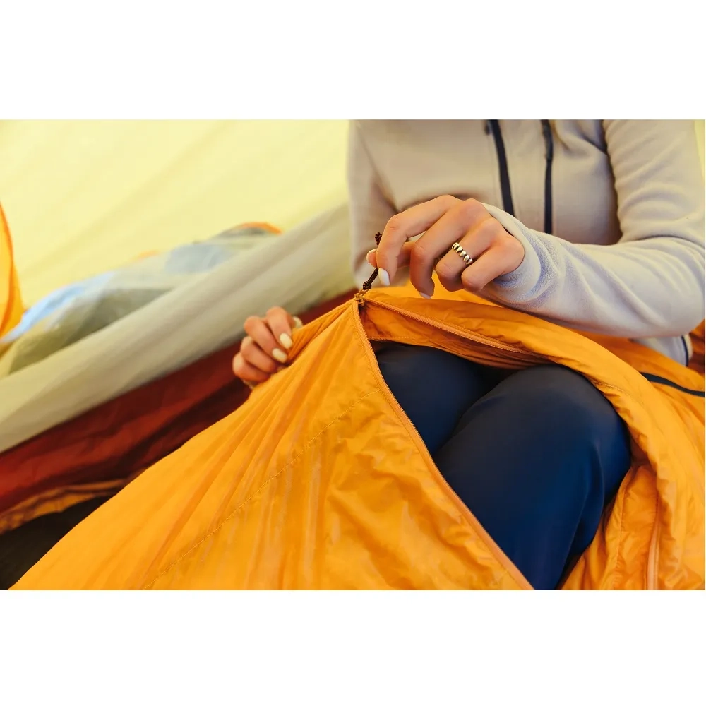 Тобі сподобається, що у спальнику можна короткочасно переміщатись у таборі, загнувши вільний нижній кінець назад. Для відчуття “ніби вдома” продумана кишеня для подушки, утеплена планка на шиї та більше пуху у ногах, всі знають, що ноги треба тримати в теплі. Для кого спальник створений? Для легкохідців, які можуть надовго пропасти в горах, або люблять подорожі на вело.